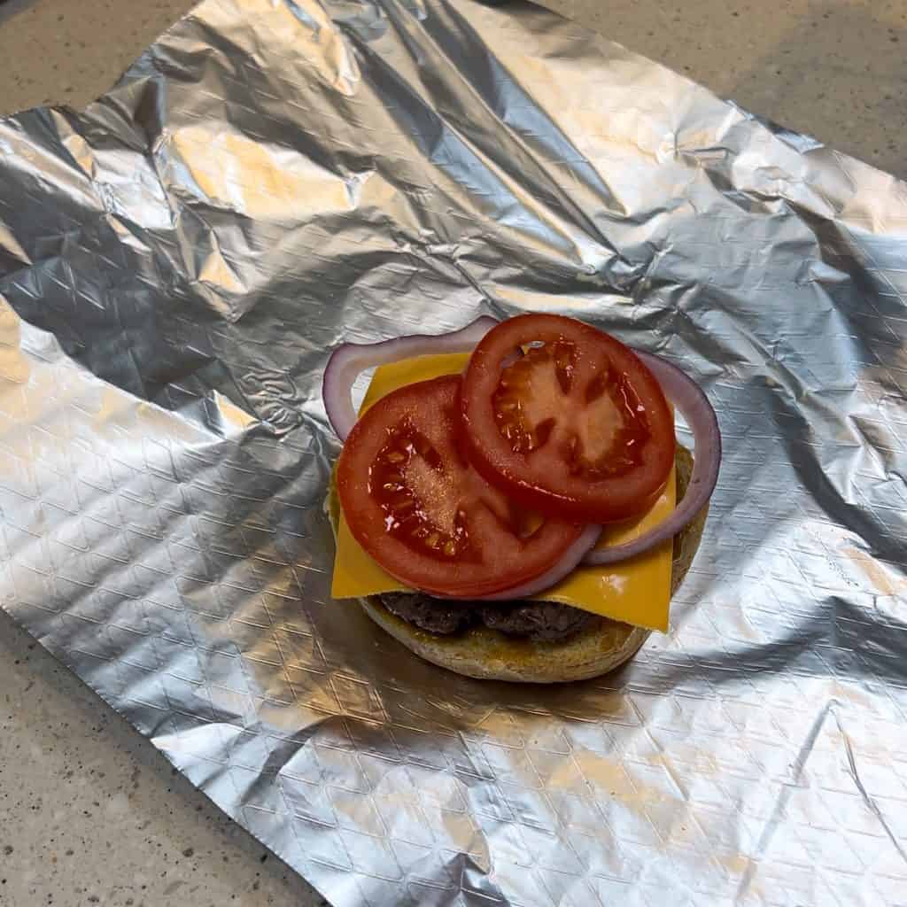 Wrap full burger in tinfoil and airfry for 5 minutes at 200C