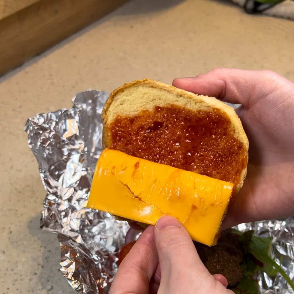 - Assemble burger as seen in video on sesame seed burger bun with tomato, red onion, english mustard, ketchup & cheese slice