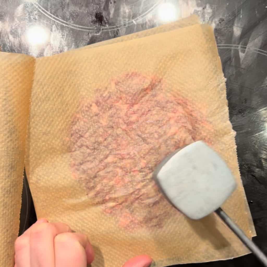 - Flatten each individual ball between greaseproof paper and flatten very thin using meat hammer (or rolling pin) - the burgers will contract when cooking so flatten as thin as possible