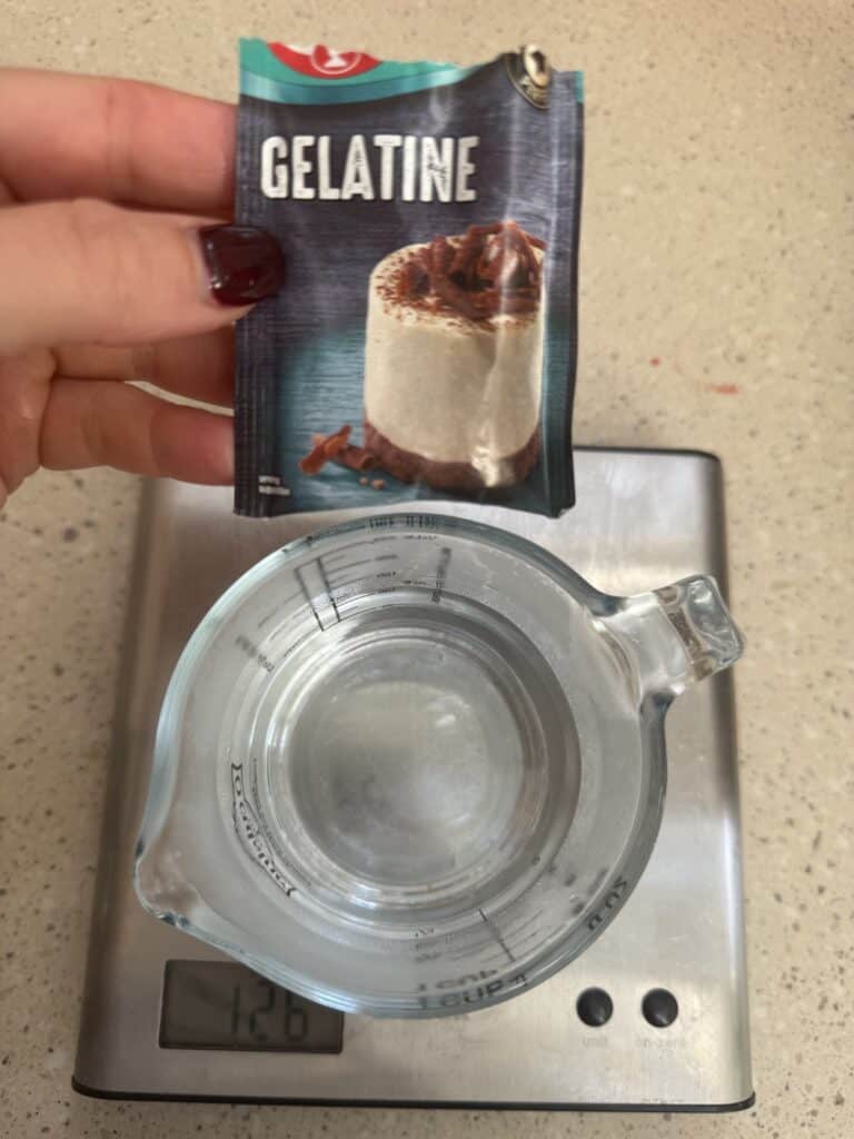 - Dissolve 12 g gelatine powder in approx. 8 tablespoon boiling water if you have the full volume (or half it if necessary)