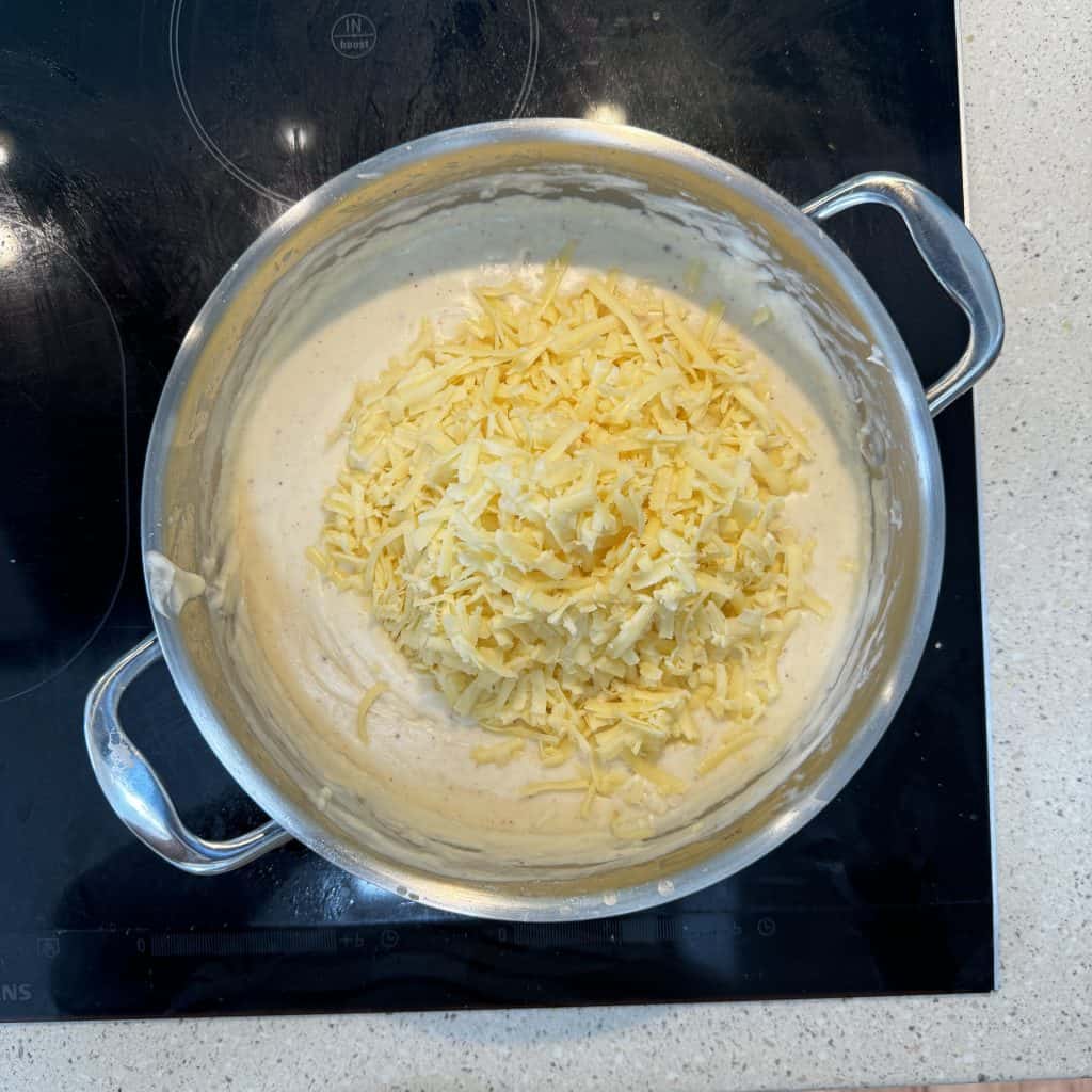 - Once all the milk has been added and you have a white sauce, add 260 g extra mature cheddar cheese (grated)