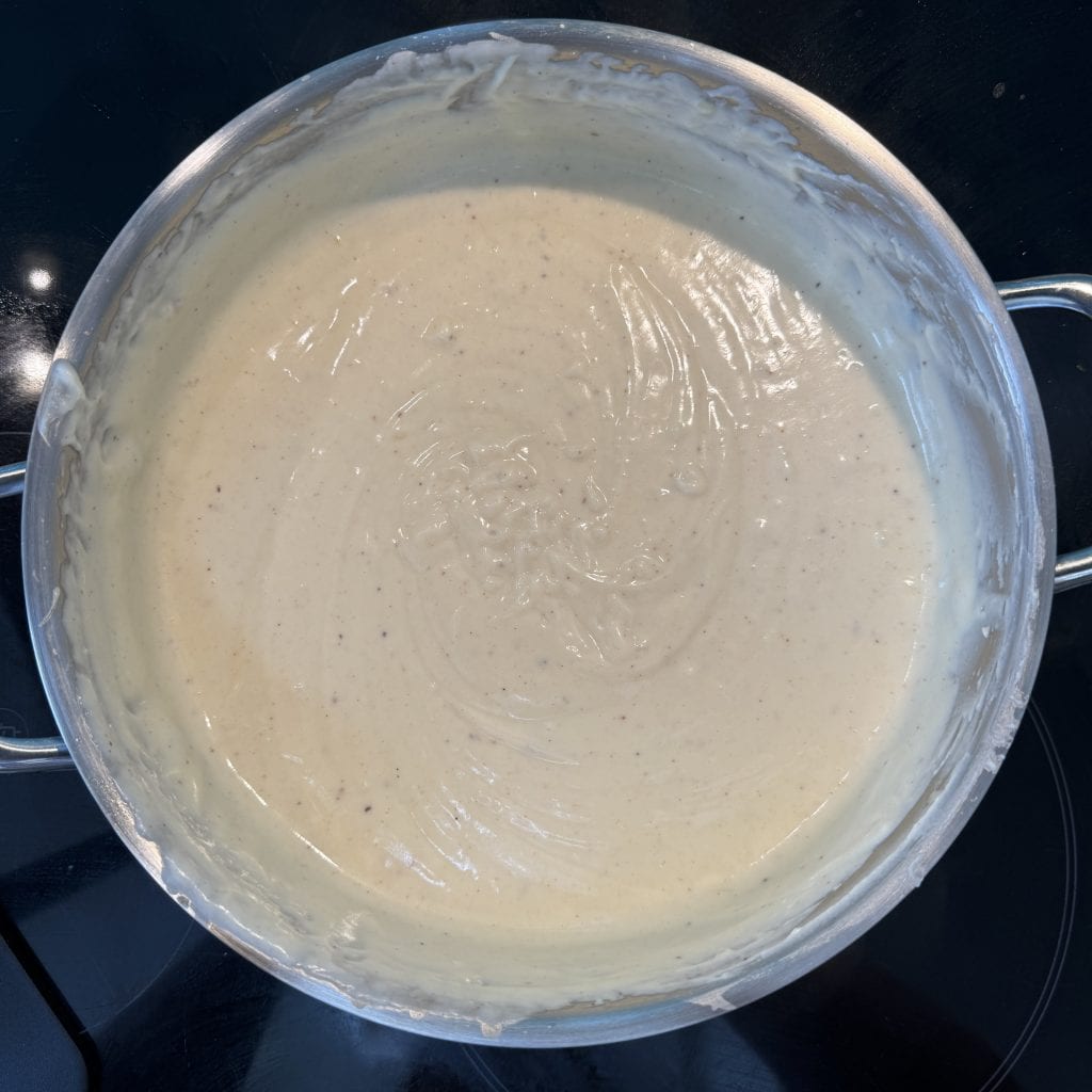Add plain flour and mix to make a roux. Cook for 1 minute on medium heat to remove the floury taste from the roux. Start adding whole milk, a little at a time, whilst whisking to start to thicken the sauce.
